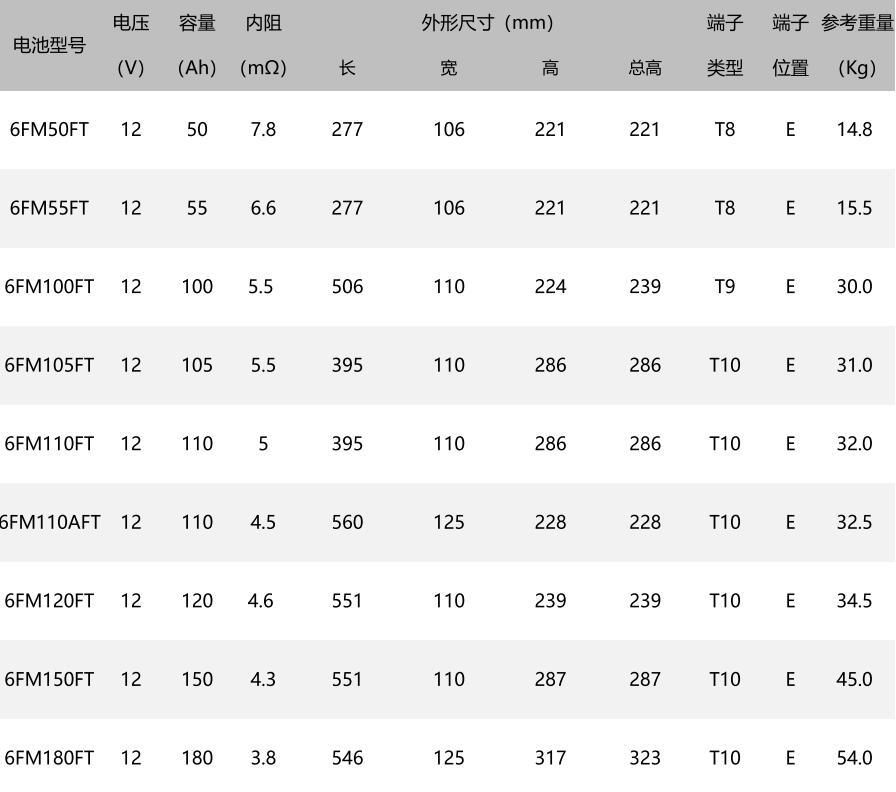 Rated capacity: 50Ah to 180Ah (10 hour rate capacity, 25°C)
